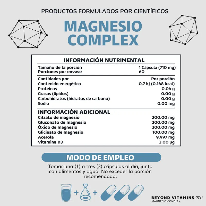 Magnesio Complex 4 en 1 es una fórmula avanzada que combina cuatro formas de magnesio biodisponible para máxima absorción y efectividad. Nuestro complejo apoya la función muscular y nerviosa, promueve la relajación y el sueño de calidad, ayuda a reducir la fatiga y contribuye a la salud ósea. La combinación sinérgica de citrato, glicinato, malato y taurinato de magnesio proporciona beneficios integrales para tu bienestar general.